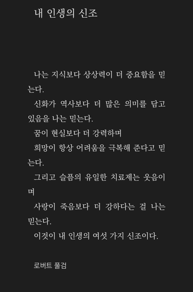 로버트 풀검의 신조는 단순히 개인의 삶의 철학으로 끝나지 않고, 가족관계와 자녀 교육에도 깊은 영향을 미칠 수 있는 가치들을 제시하는 거 같습니다. 부모로써 인간으로서 여섯 가지 신조를 자녀와 함께 나누고, 이를 바탕으로 인생에서 어떤 가치와 신념을 가지고 살아야 하는지, 아이들의 존재 이유와 삶의 의미, 방향성을 제시하는 것은 그들이 더 나은 사람으로 성장하도록 스스로 정의하는 더 나은 자신과 세상을 창조하는 존재임을 나타냅니다,